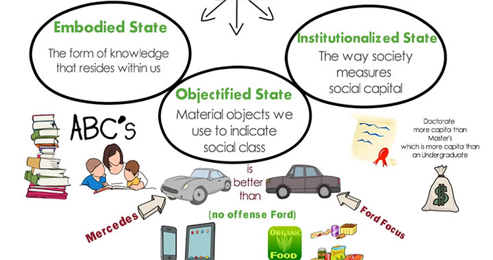 부르디외는 자본이 경제적 자본뿐만 아니라 인맥과 같은 관계에 대한 자본 그리고 문화적 자본의 형태를 띠고 있다고 말합니다. 문화자본에는 예술작품, 책과 같은 문화적 상징이 되는 것들과 석,박사 학위처럼 제도적으로 인정받을 수 있는 지식 등이 있습니다.